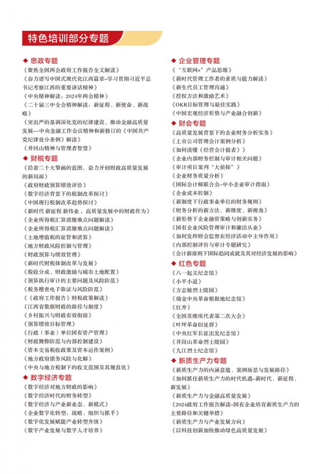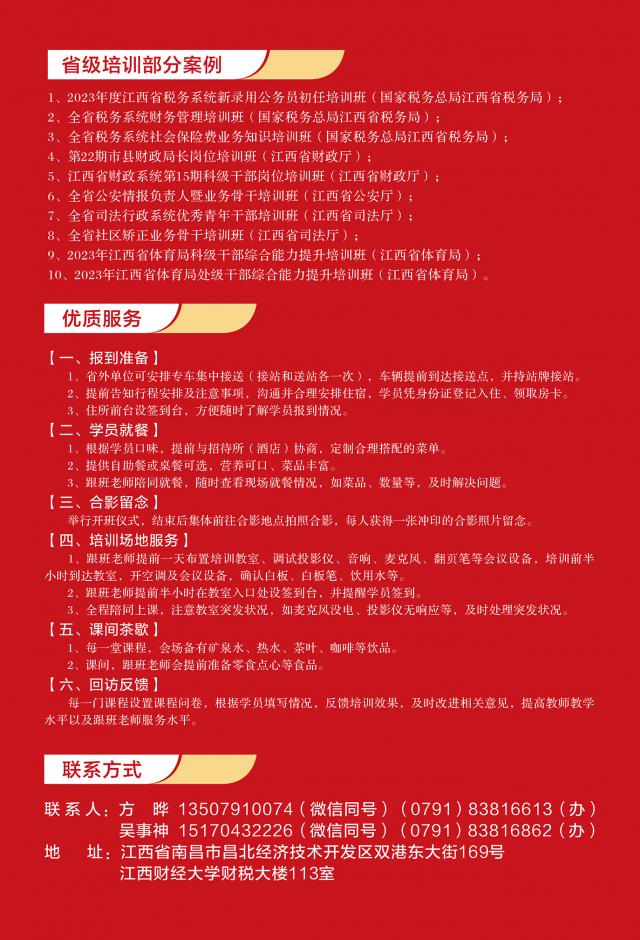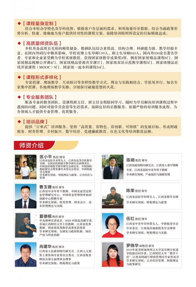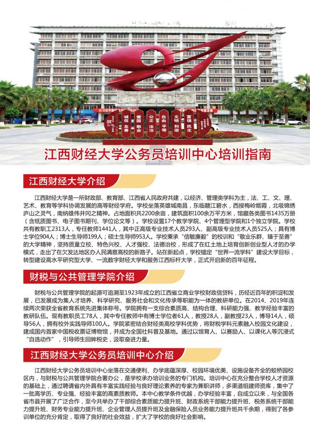 江西财经大学公务员培训中心坐落在交通便利、办学底蕴深厚、校园环境优美、设施设备齐全的蛟桥园校区内,与足球彩票 合署办公,是学校承办培训业务的专门机构。培训中心在充分整合学校人才资源的基础上,通过聘请省内外具有丰富实践经验与良好理论素养的专家为兼职讲师,多渠道组建师资库,集中了一批高学历、专业强、经验丰富的高素质教师。本中心教学条件优越,办学经验丰富,自成立以来,与全国各省市县开展了广泛合作,至今共举办了干部综合素质能力提升班、财政系统干部能力提升班、税务系统干部能力提升班、财务专业能力提升班、企业管理人员提升班及金融保险人员业务能力提升班共千余期,得到了各参训单位的充分肯定,取得了良好的社会效益,扩大了学校的良好社会影响。