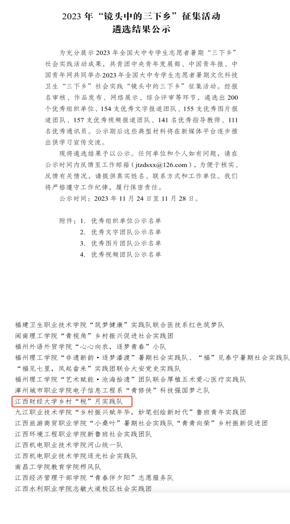 “镜头中的三下乡”活动启动后,共有千余所学校的数万支团队报名参与,活动组织方通过网络展示及专家评审,遴选出优秀组织单位200个、优秀文字报道团队154个、优秀图片报道团队155个、优秀视频报道团队157个、优秀指导教师141名、优秀通讯员111名。