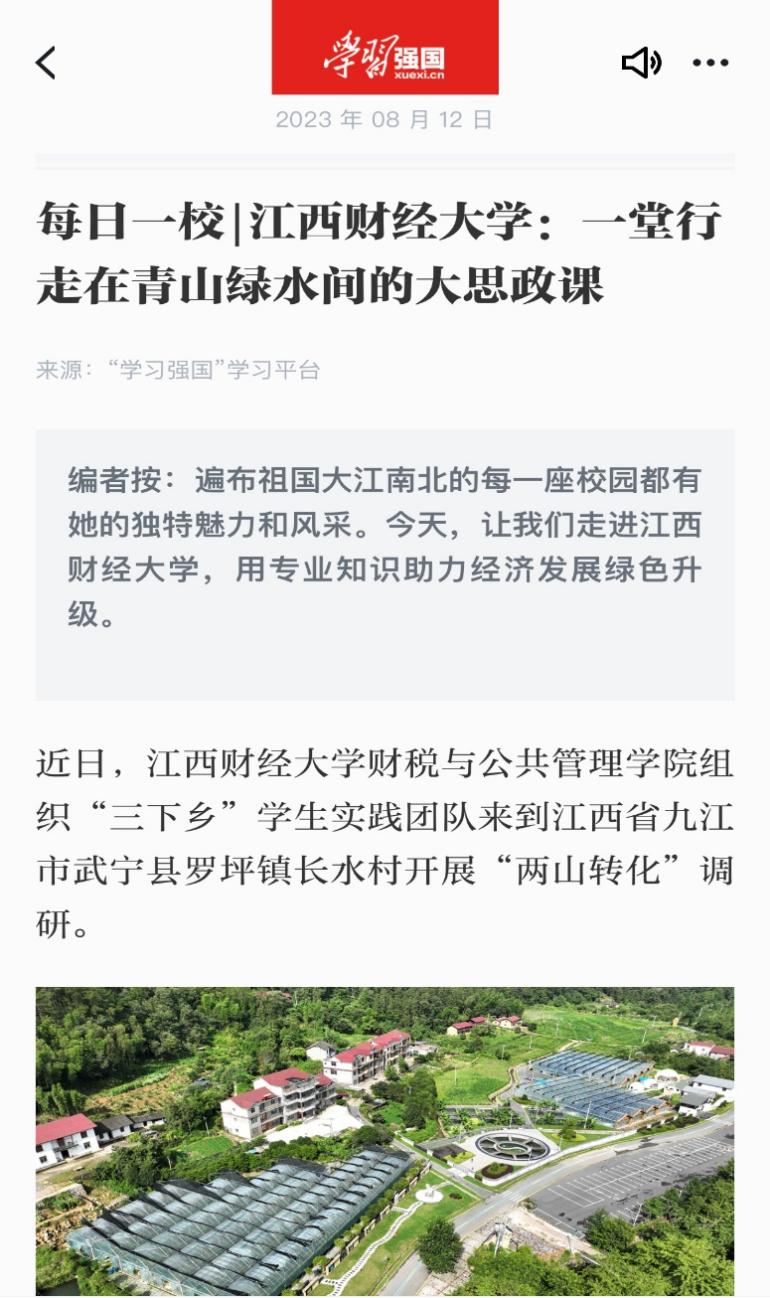 7月中旬,学院选拔七名优秀本科生组成“乡村税月”实践队,在指导老师付泉的带领下,前往被称为“中国林改第一村”的武宁县罗坪镇长水村开展社会实践,结合学生专业特点,开展涉农企业、涉农项目发展咨询,农村文旅宣介,发掘当地森林康养旅游产业开发潜力,以实际行动助力乡村振兴。学习强国全国总平台、中国青年网、江西日报、江西教育网、青新闻等媒体先后对团队的相关事迹进行报道。