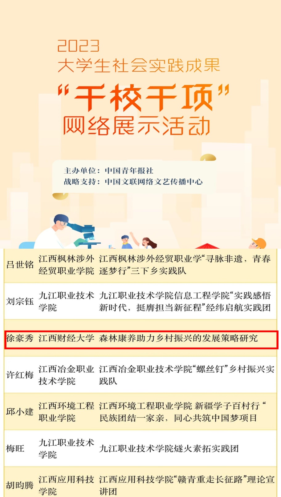 据悉,实践团队还参与了由中国青年报社主办的2023大学生社会实践成果“千校千项”网络展示活动,团队成员完成的调研报告《森林康养助力乡村振兴的发展策略研究》成功被评选为“全国优秀实践项目”。